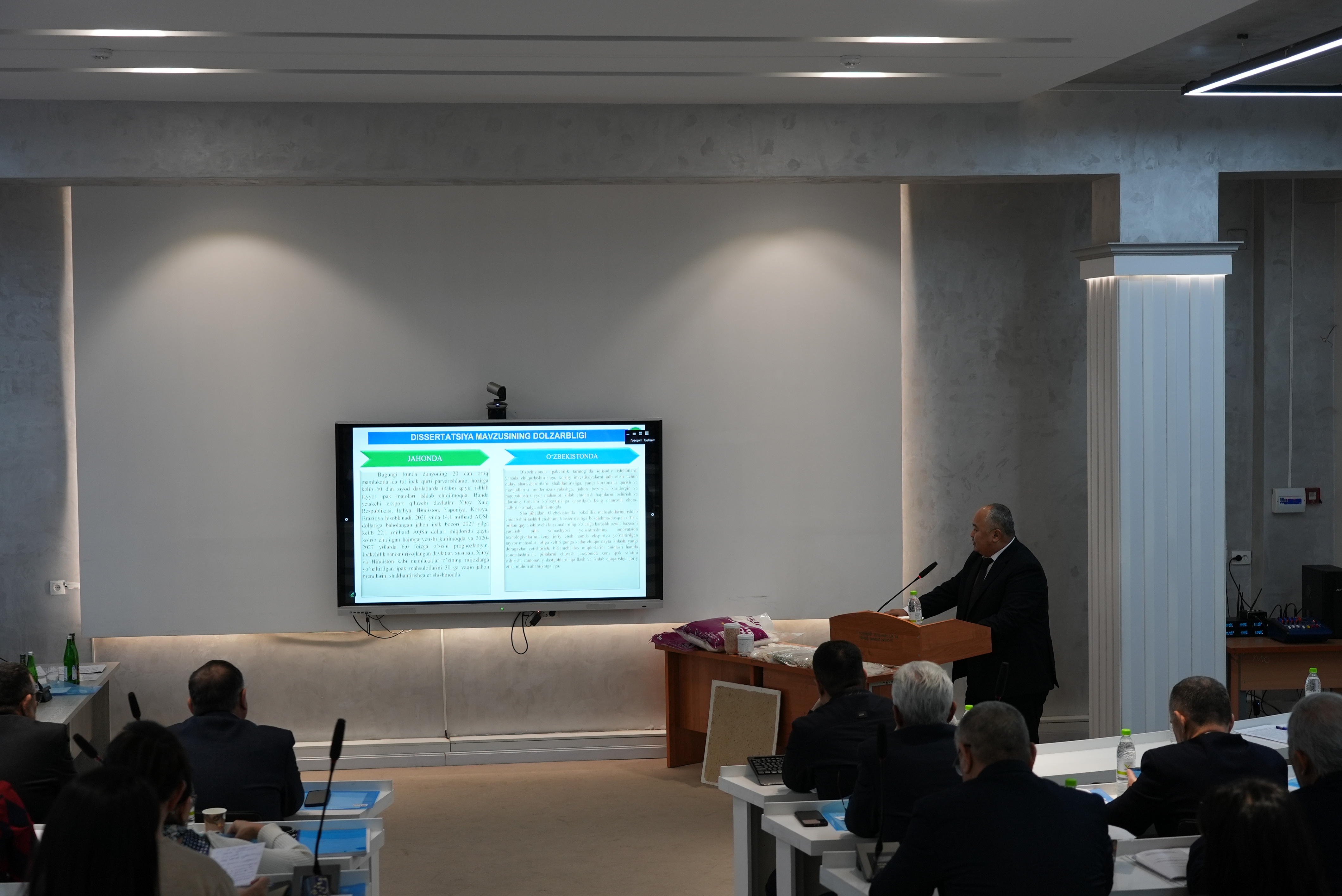 Eshmirzayev Alisher Pardayevichning “Mahalliy xomashyodan “Mahalliy pillalardan yuqori sifatli xom ipak olish va losini qayta ishlash texnologiyalarini asoslash” mavzusidagi 05.06.02 – “To‘qimachilik materiallari texnologiyasi va xomashyoga dastlabki ishlov berish” ixtisosligi bo‘yicha texnika fanlari doktori (DSc) dissertatsiyasining himoyasi bo’lib o’tdi.